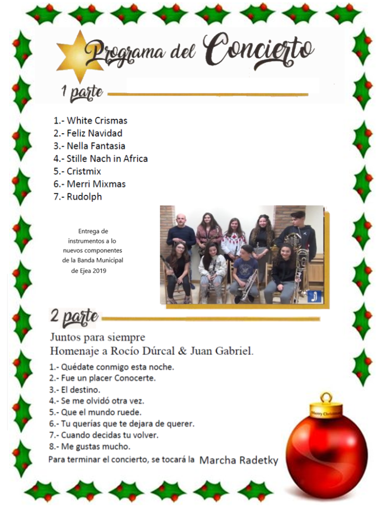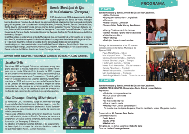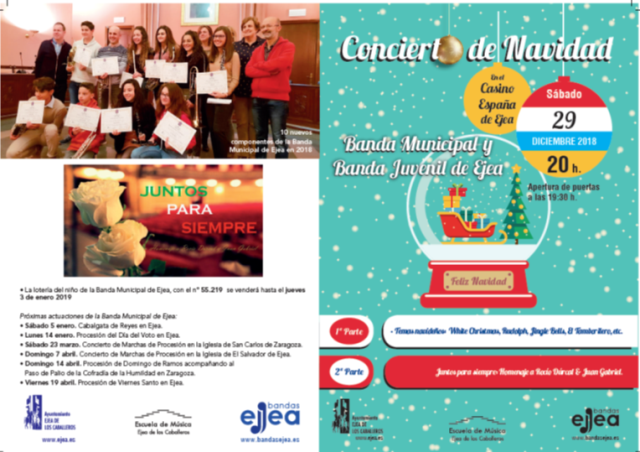 Como viene siendo habitual este proxino Sabado 29 DICIEMBRE a las 20 h. en el casino España, la Bandas Municipal de Ejea con los músicos de la Banda Juvenil de Ejea, realizarán el tradicional Concierto de Navidad, en esta ocasión estarán acompañados por los cantantes: David, Jesika y Mikel, para hacer Homenaje a Rocío Dúrcal & Juan Gabriel.